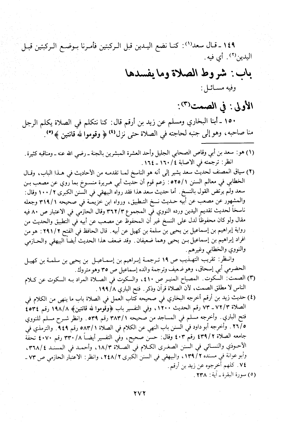 150 - أبنا البخاري ومسلم عن زيد بن أرقم قال: كنا نتكلم في الصلاة يكلم الرجل منا صاحبه، وهو إلى جنبه لحاجته في الصلاة حتى نزل (¬4) {وقوموا لله قانتين} (¬5).