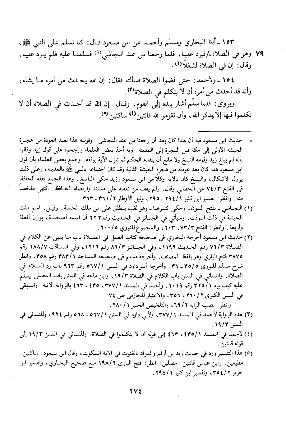 153 - أبنا البخاري ومسلم وأحمد عن ابن مسعود قال: كنا نسلم على النبي - صلى الله عليه وسلم -، وهو في الصلاة، فيرد علينا، فلما رجعنا من عند النجاشي (¬1) فسلمنا عليه فلم يرد علينا، وقال: إن في الصلاة لشغلًا (¬2).