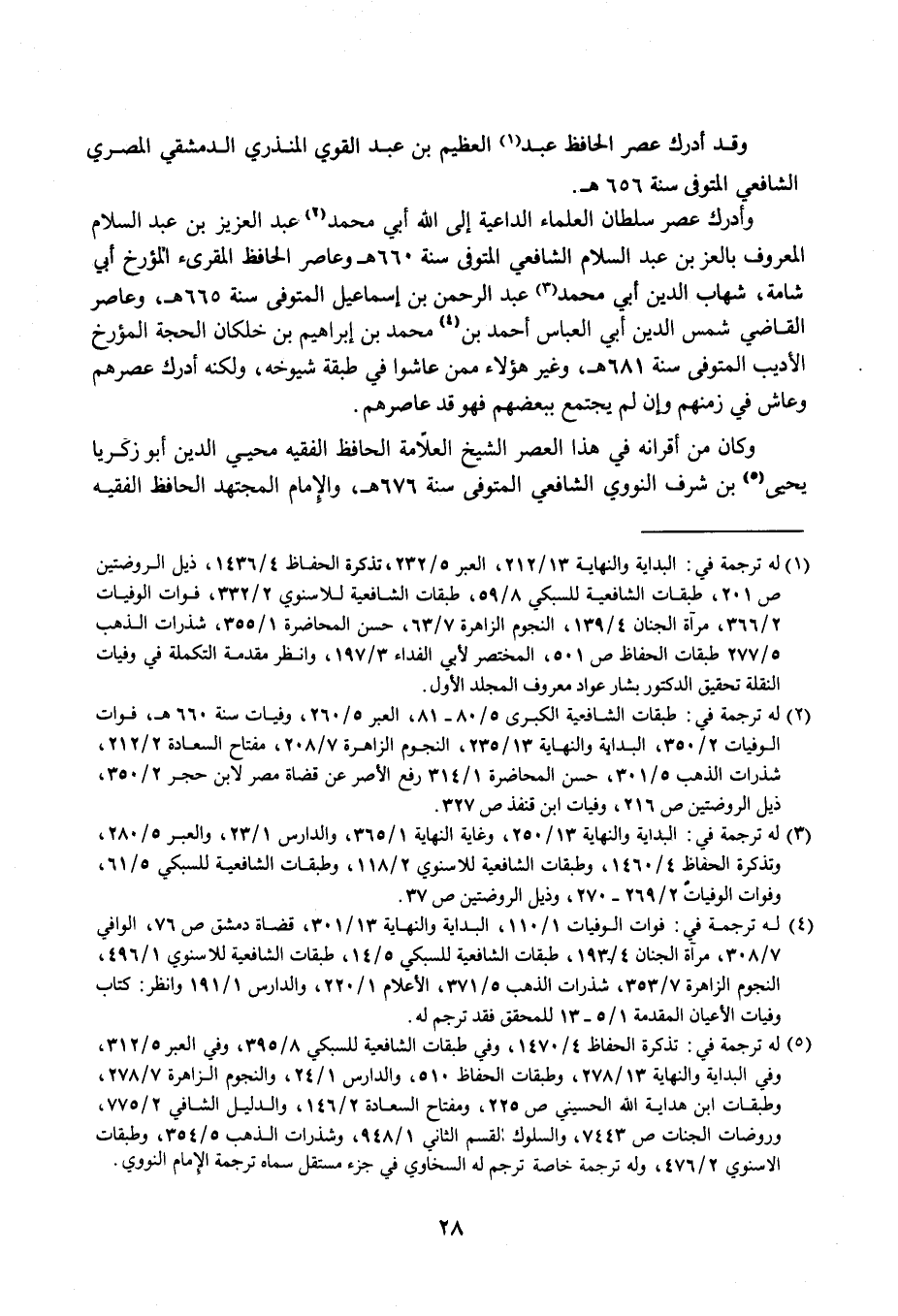 (¬5) له ترجمة في: تذكرة الحفاظ 4/ 1470، وفي طبقات الشافعية للسبكي 5/ 398، وفي العبر 5/ 312، وفي البداية والنهاية 13/ 278، وطبقات الحفاظ 510, والدارس 1/ 24، والنجوم الزاهرة 7/ 278 , وطبقات ابن هداية الله الحسيني ص 225، ومفتاح السعادة 2/ 146، والدليل الشافي 2/ 775، وروضات الجنات ص 7443، والسلوك القسم الثاني 1/ 948، وشذرات الذهب 5/ 354، وطبقات الإسنوي 2/ 476، وله ترجمة خاصة ترجم له السخاوي في جزء مستقل سماه ترجمة الإمام النووي.
