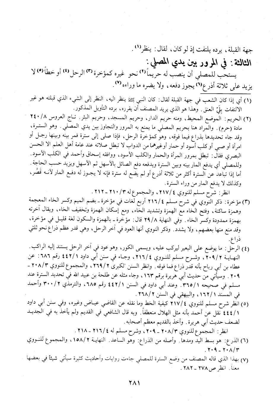 (¬7) بهذا الذي قاله المصنف من وضع السترة للمصلي جاءت روايات وأحاديث كثيرة سيأتي شيئًا في بعضها معنًا. انظر ص 278 - 282.