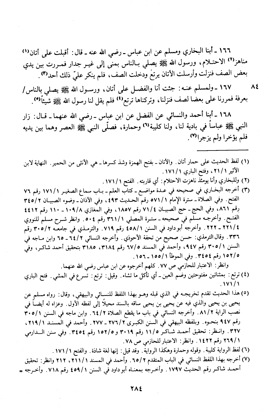 167 - ولمسلم عنه: جئت أنا والفضل على أتان، ورسول الله - صلى الله عليه وسلم - يصلي بالناس بعرفة فمررنا على بعضا لصف فنزلنا، وتركناها ترتع (¬4) فلم يقل لنا رسول الله - صلى الله عليه وسلم - شيئًا (¬5).