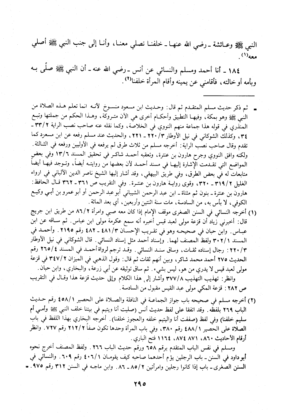 184 - أنا أحمد ومسلم والنسائي عن أنس - رضي الله عنه - أن النبي - صلى الله عليه وسلم - صلّى به وبأمه أو خالته، فأقامني عن يمينه وأقام المرأة خلفنا (¬2).