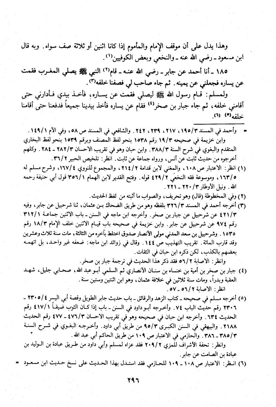 185 - أنا أحمد عن جابر - رضي الله عنه - قام (¬2) النبي - صلى الله عليه وسلم - يصلي المغرب فقمت عن يساره فجعلني عن يمينه. ثم جاء صاحب لي فصفنا خلفه (¬3).
