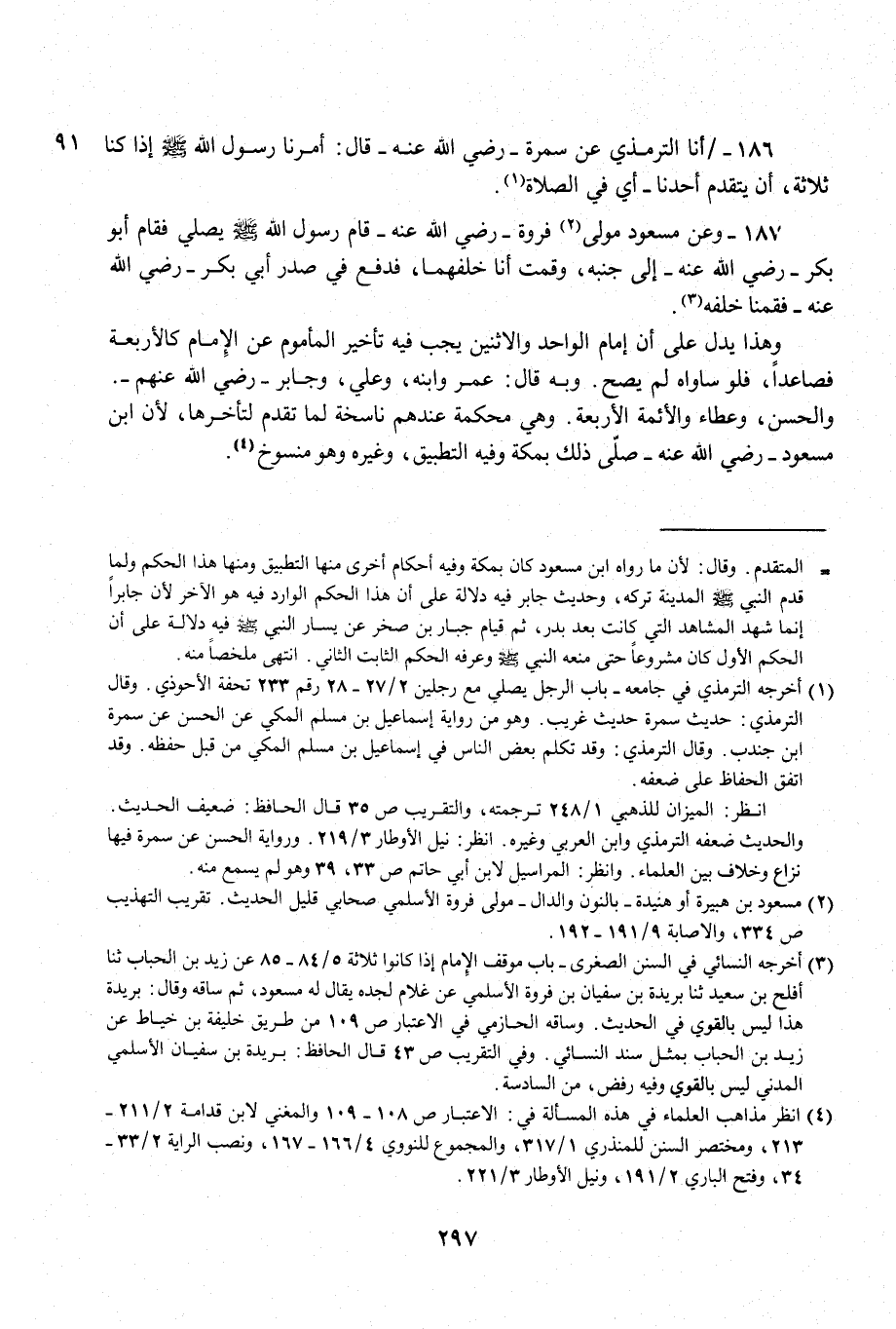 186 - أنا الترمذي عن سمرة - رضي الله عنه - قال: أمرنا رسول الله - صلى الله عليه وسلم - إذا كنا ثلاثة، أن يتقدم أحدنا - أي في الصلاة (¬1).