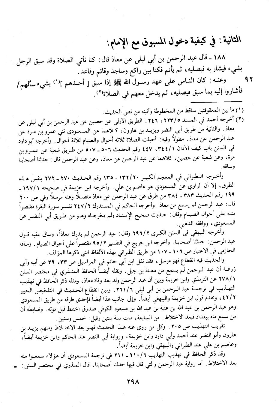 188 - قال عبد الرحمن بن أبي ليلى عن معاذ قال: كنا نأتي الصلاة وقد سبق الرجل بشيء فيشار به فيصليه، ثم يأتم فكنا بين راكع وساجد وقائم وقاعد.