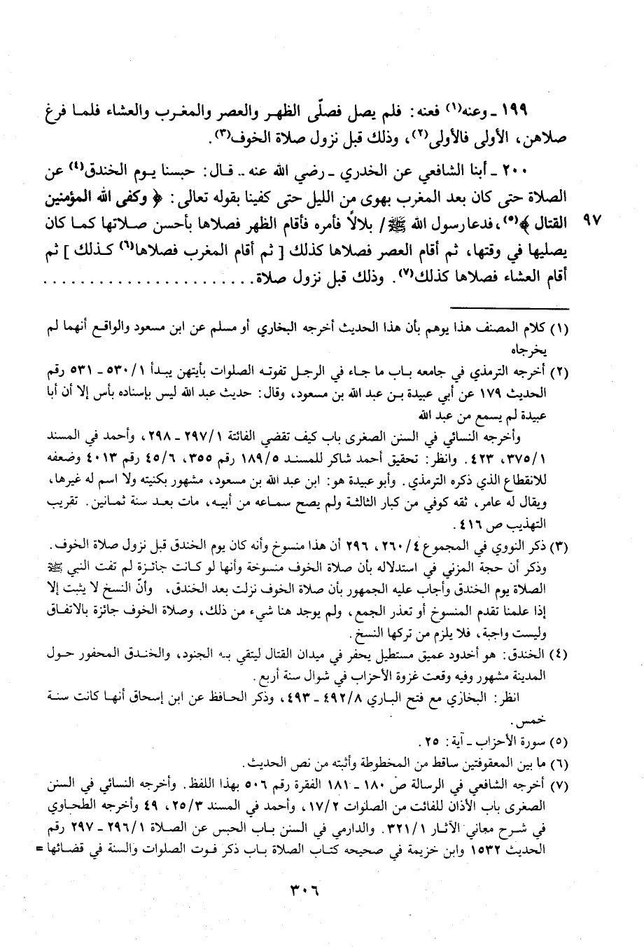 (¬3) ذكر النووي في المجموع 4/ 260، 296 أن هذا منسوخ وأنه كان يوم الخندق قبل نزول صلاة الخوف. وذكر أن حجة المزني في استدلاله بأن صلاة الخوف منسوخة وأنها لو كانت جائزة لم تفت النبي - صلى الله عليه وسلم - الصلاة يوم الخندق وأجاب عليه الجمهور بأن صلاة الخوف نزلت بعد الخندق، وأن النسخ لا يثبت إلا إذا علمنا تقدم المنسوخ أو تعذر الجمع، ولم يوجد هنا شيء من ذلك، وصلاة الخوف جائزة بالاتفاق وليست واجبة، فلا يلزم من تركها النسخ.