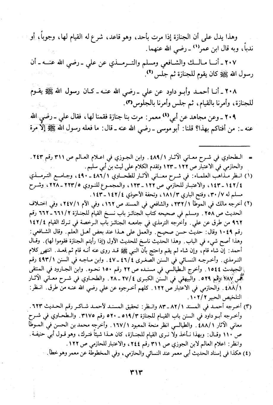 207 - أنا مالك والشافعي ومسلم والترمذي عن علي -رضي الله عنه - أن رسول الله - صلى الله عليه وسلم - كان يقوم للجنازة ثم جلس (¬2).