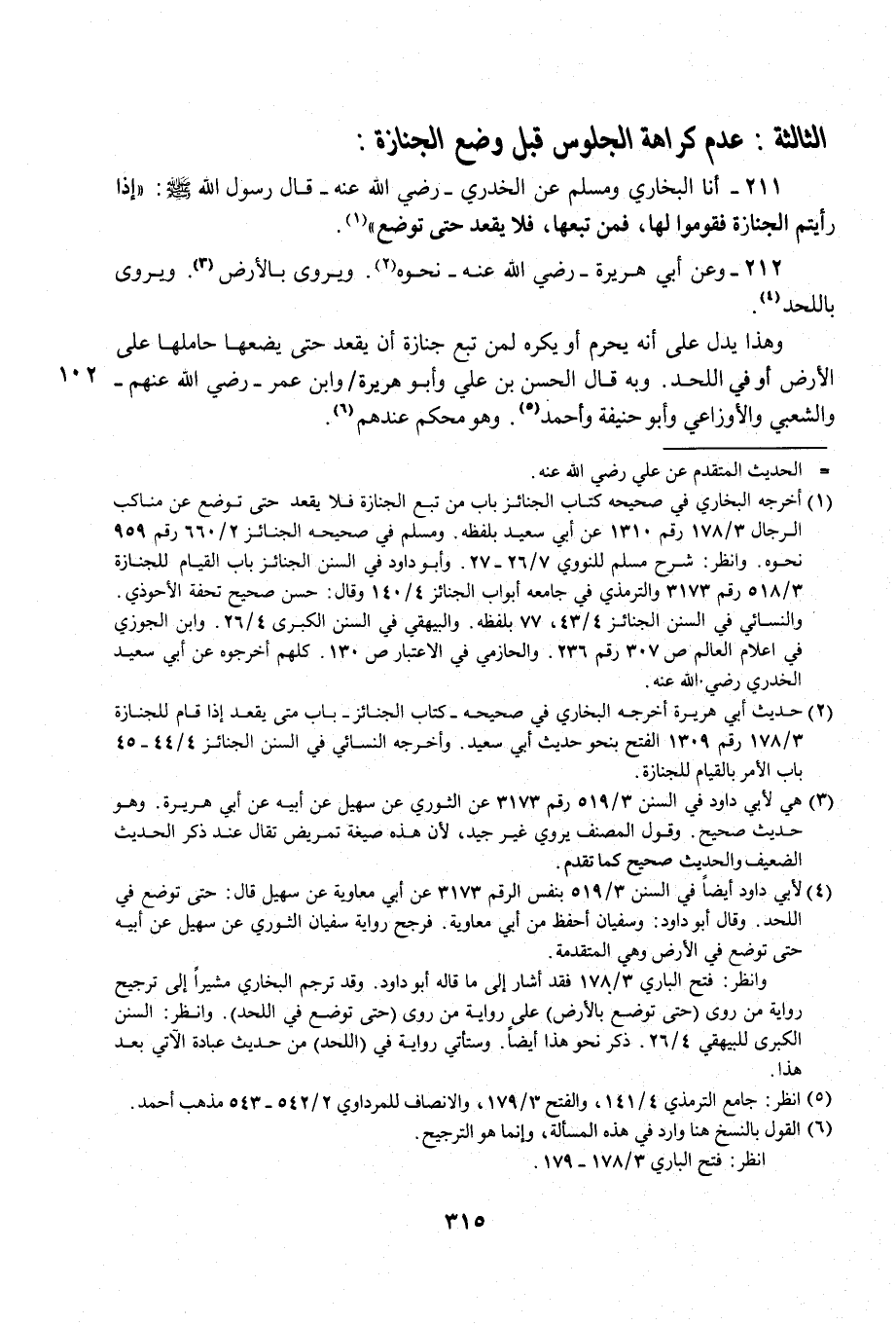 211 - أنا البخاري ومسلم عن الخدري - رضي الله عنه - قال رسول الله - صلى الله عليه وسلم -: "إذا رأيتم الجنازة فقوموا لها، فمن تبعها، فلا يقعد حتى توضع" (¬1).