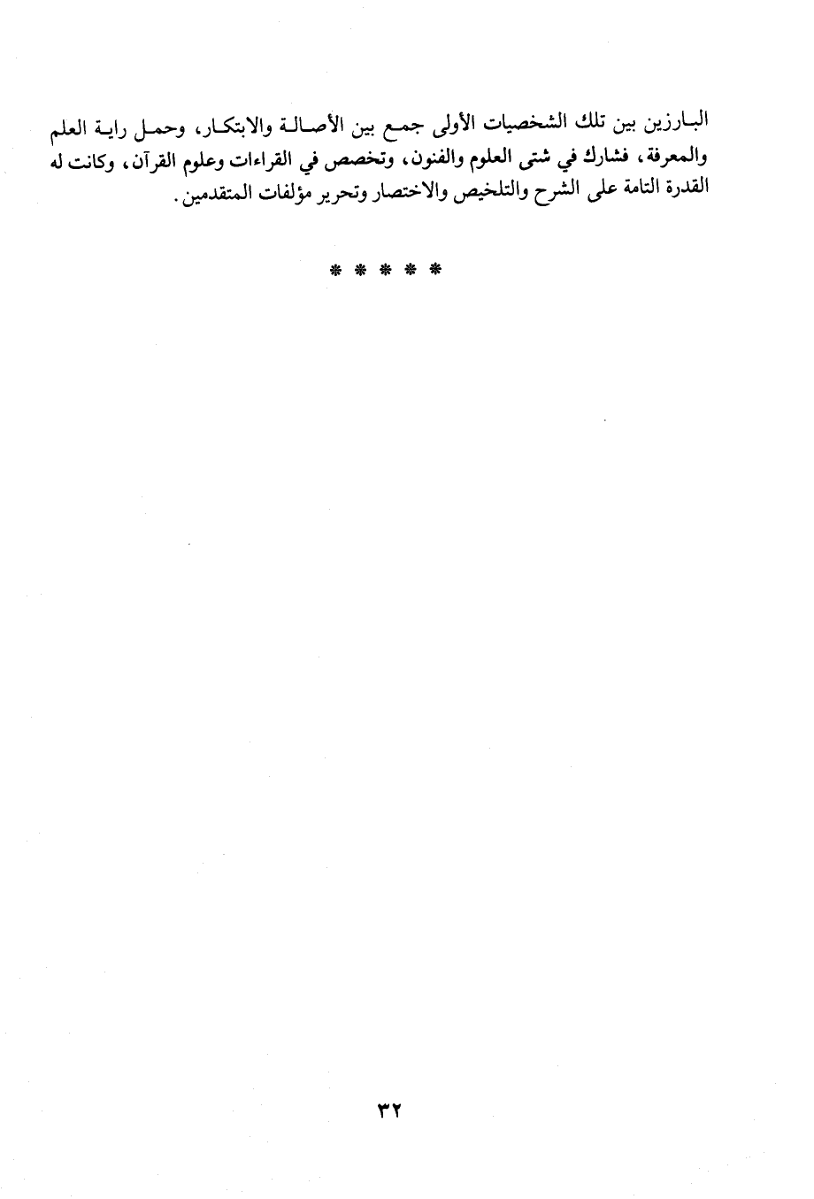 البارزين بين تلك الشخصيات الأولى جمع بين الأصالة والابتكار، وحمل راية العلم والمعرفة، فشارك في شتى العلوم والفنون، وتخصص في القراءات وعلوم القرآن، وكانت له القدرة التامة على الشرح والتلخيص والاختصار وتحرير مؤلفات المتقدمين.