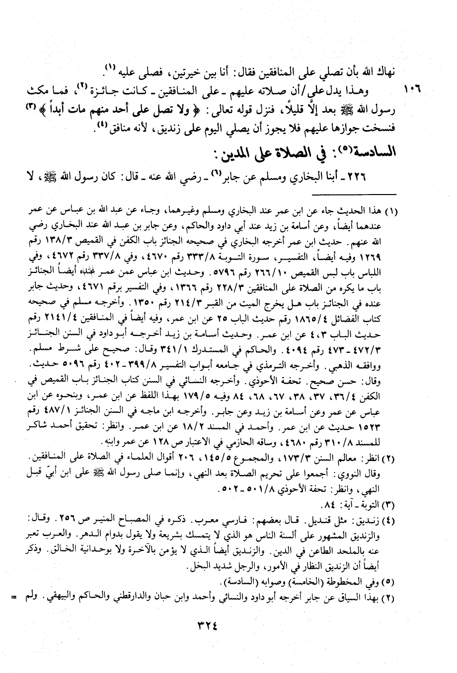 (¬2) انظر: معالم السنن 3/ 173، والمجموع 5/ 145، 206 أقوال العلماء في الصلاة على المنافقين. وقال النووي: أجمعوا على تحريم الصلاة بعد النهي، وإنما صلى رسول الله - صلى الله عليه وسلم - على ابن أبيّ قبل النهي، وانظر: تحفة الأحوذي 8/ 501 - 502.
