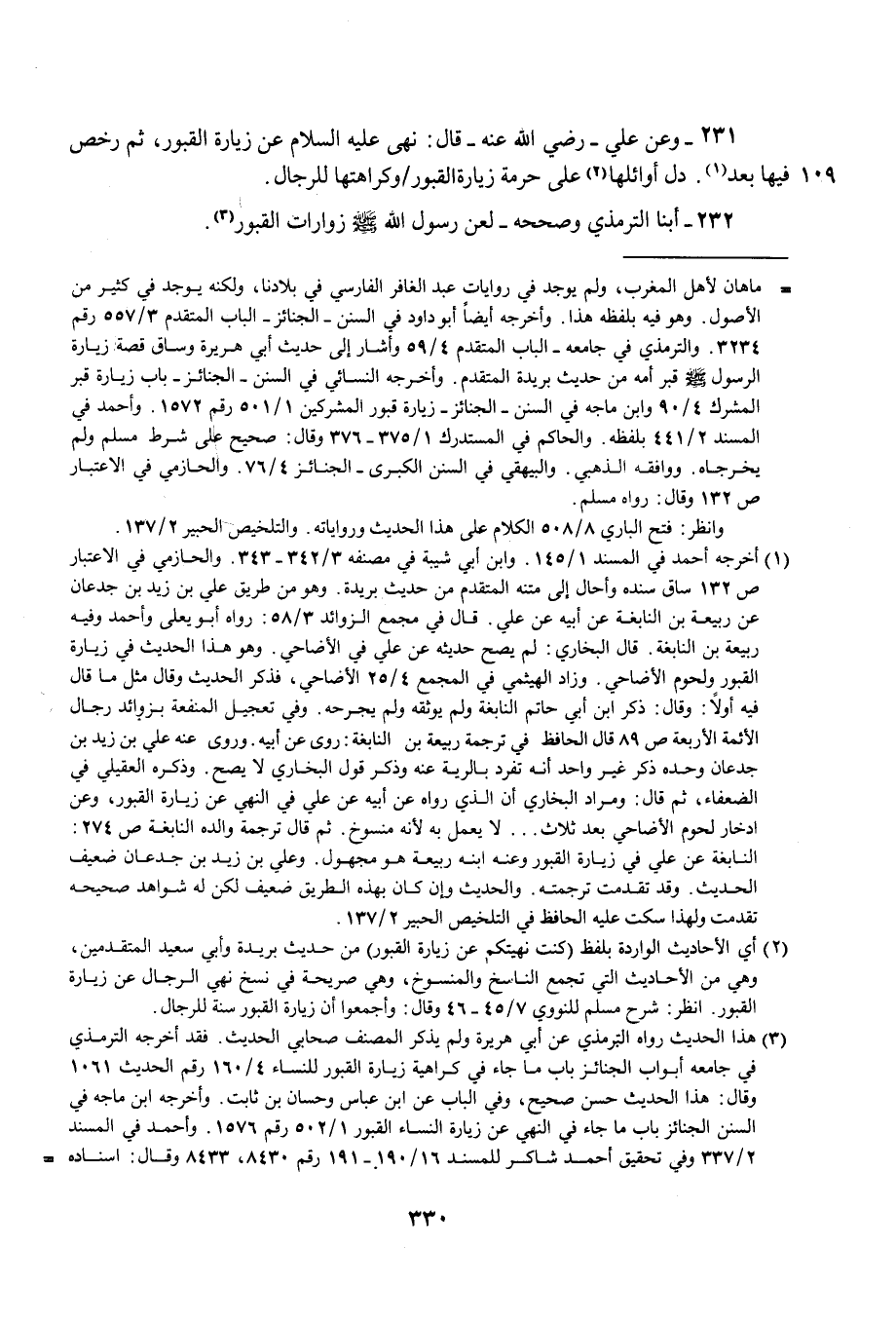 231 - وعن علي -رضي الله عنه - قال: نهى عليه السلام عن زيارة القبور، ثم رخص فيها بعد (¬1). دل أوائلها (¬2) على حرمة زيارة القبور وكراهتها للرجال.