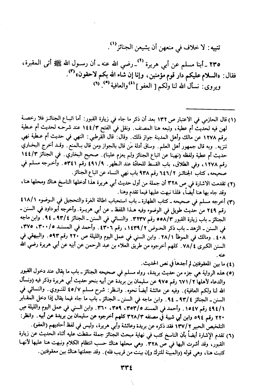 235 - أبنا مسلم عن أبي هريرة (¬2) -رضي الله عنه - أن رسول الله - صلى الله عليه وسلم - أتى المقبرة، فقال: "السلام عليكم دار قوم مؤمنين، وإنا إن شاء الله بكم لاحقون" (¬3).