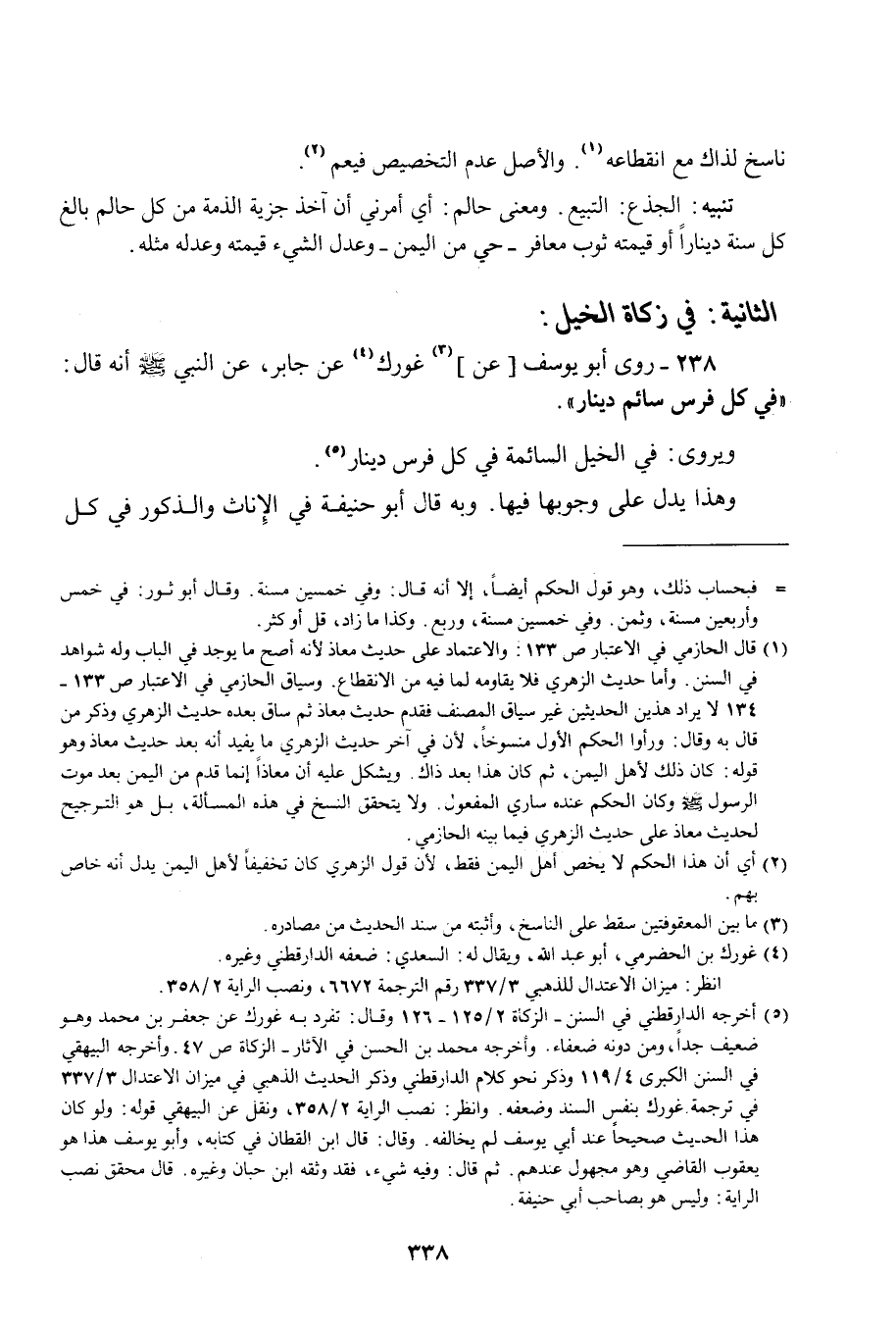 238 - روى أبو يوسف [عن] (¬3) غورك (¬4) عن جابر، عن النبي - صلى الله عليه وسلم - أنه قال: "في كل فرس سائم دينار".
