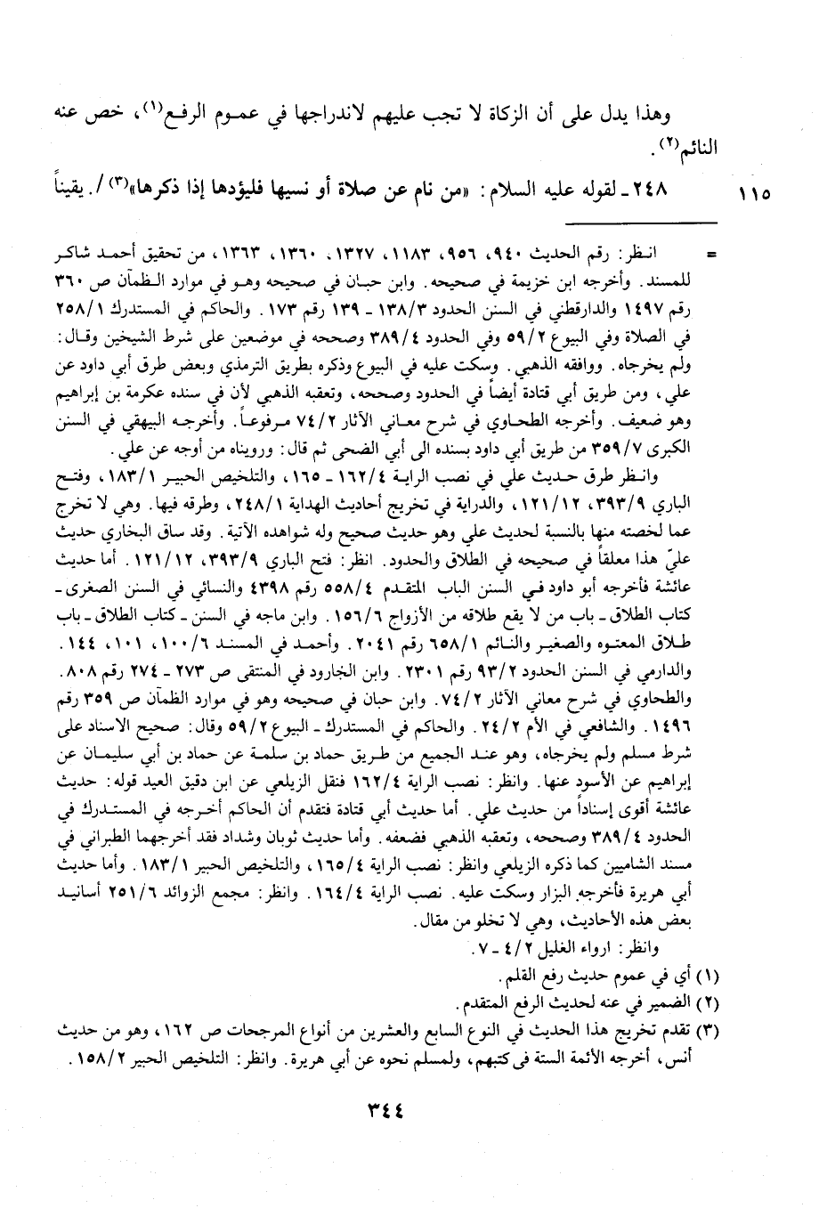 وانظر طرق حديث علي في نصب الراية 4/ 162 - 165، والتلخيص الحبير 1/ 183، وفتح الباري 9/ 393، 12/ 121، والدراية في تخريج أحاديث الهداية 1/ 248، وطرقه فيها. وهي لا تخرج عما لخصته منها بالنسبة لحديث علي وهو حديث صحيح وله شواهده الآتية. وقد ساق البخاري حديث عليّ هذا معلقًا في صحيحه في الطلاق والحدود. انظر: فتح الباري 9/ 393، 12/ 121. أما حديث عائشة فأخرجه أبو داود في السنن الباب المتقدم 4/ 558 رقم 4398 والنسائي في السنن الصغرى - كتاب الطلاق- باب من لا يقع طلاقه من الأزواج 6/ 156. وابن ماجه في السنن -كتاب الطلاق- باب طلاق المعتوه والصغير والنائم 1/ 658 رقم 2041. وأحمد في المسند 6/ 100، 101، 144. والدارمي في السنن الحدود 2/ 93 رقم 2301. وابن الجارود في المنتقى ص 273 - 274 رقم 808. والطحاوي في شرح معاني الآثار 2/ 74. وابن حبان في صحيحه وهو في موارد الظمآن ص 359 رقم 1496. والشافعي في الأم 2/ 24. والحاكم في المستدرك - البيوع 2/ 59 وقال: صحيح الإسناد على شرط مسلم ولم يخرجاه، وهو عند الجميع من طريق حماد بن سلمة عن حماد بن أبي سليمان عن إبراهيم عن الأسود عنها. وانظر: نصب الراية 4/ 162 فنقل الزيلعي عن ابن دقيق العيد قوله: حديث عائشة أقوى إسنادًا من حديث علي. أما حديث أبي قتادة فتقدم أن الحاكم أخرجه في المستدرك في الحدود 4/ 389 وصححه، وتعقبه الذهبي فضعفه. وأما حديث ثوبان وشداد فقد أخرجهما الطبراني في مسند الشاميين كما ذكره الزيلعي وانظر: نصب الراية 4/ 165، والتلخيص الحبير 1/ 183. وأما حديث أبي هريرة فأخرجه البزار وسكت عليه. نصب الراية 4/ 164. وانظر: مجمع الزوائد 6/ 251 أسانيد بعض هذه الأحاديث، وهي لا تخلو من مقال.