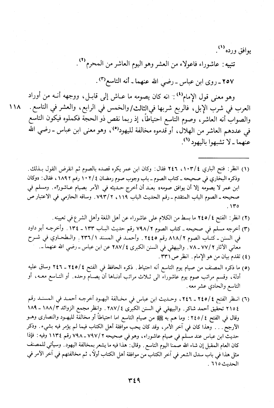 (¬6) انظر الفتح 4/ 245 - 246، وحديث ابن عباس في مخالفة اليهود أخرجه أحمد في المسند رقم 2154 تحقيق أحمد شاكر. والبيهقي في السنن الكبرى 4/ 287. وانظر مجمع الزوائد 3/ 188 - 189 وقال في الفتح 4/ 245: وما هم به - صلى الله عليه وسلم - من صيام التاسع إما احتياطًا أو مخالفة لليهود والنصارى وهو الأرجح ... وهذا كان في آخر الأمر، وقد كان يحب موافقة أهل الكتاب فيما لم يؤمر فيه بشيء. وذكر حديث ابن عباس عند مسلم في صيام عاشوراء، وهو في صحيحه 2/ 797 - 798 رقم 1134 وفيه: فإذا كان العام المقبل إن شاء الله صمنا اليوم التاسع. وقال: هذا فيه ما يشعر بمخالفة اليهود. وسيأتي للمصنف مثل هذا في باب سدل الشعر في آخر الكتاب من موافقة أهل الكتاب أولًا، ثم مخالفتهم في آخر الأمر في الحديث 615.