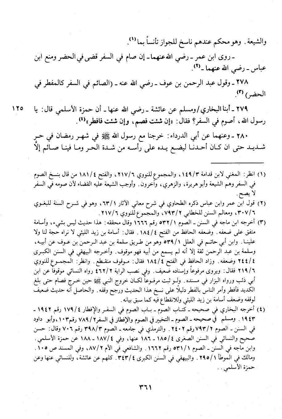 279 - أبنا البخاري ومسلم عن عائشة - رضي الله عنها - أن حمزة الأسلمي قال: يا رسول الله، أصوم في السفر؟ فقال: "إن شئت فصم، وإن شئت فافطر" (¬4).