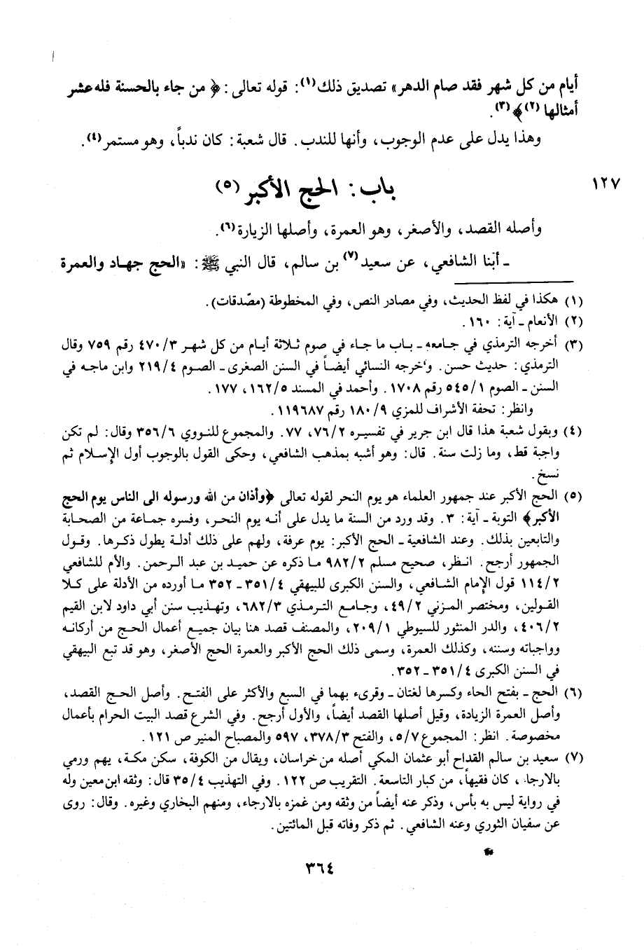 (¬5) الحج الأكبر عند جمهور العلماء هو يوم النحر لقوله تعالى {وَأَذَانٌ مِنَ اللَّهِ وَرَسُولِهِ إِلَى النَّاسِ يَوْمَ الْحَجِّ الْأَكْبَرِ} التوبة - آية: 3. وقد ورد من السنة ما يدل على أنه يوم النحر، وفسره جماعة من الصحابة والتابعين بذلك. وعند الشافعية - الحج الأكبر: يوم عرفة، ولهم على ذلك أدلة يطول ذكرها. وقول الجمهور أرجح. انظر، صحيح مسلم 2/ 982 ما ذكره عن حميد بن عبد الرحمن. والأم للشافعي 2/ 114 قول الإمام الشافعي، والسنن الكبرى للبيهقي 4/ 351 - 352 ما أورده من الأدلة على كلا القولين، ومختصر المزني 2/ 49، وجامع الترمذي 3/ 682، وتهذيب سنن أبي داود لابن القيم 2/ 406، والدر المنثور للسيوطي 1/ 209، والمصنف قصد هنا بيان جميع أعمال الحج من أركانه وواجباته وسننه، وكذلك العمرة، وسمى ذلك الحج الأكبر والعمرة الحج الأصغر، وهو قد تبع البيهقي في السنن الكبرى 4/ 351 - 352.