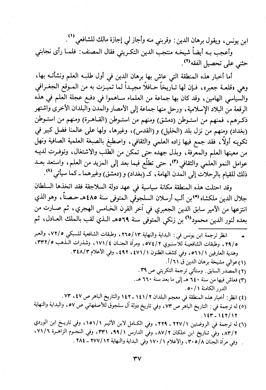 أما أخبار هذه المنطقة التي عاش بها برهان الدين في أول طلبه العلم ونشأته بها، وهي "قلعة جعبر"، فإن لها تاريخًا حافلًا مجيدًا لما تميزت به من الموقع الجغرافي والسياسي الهامين، وقد كان بها جماعة من العلماء ساهموا في دفع عجلة العلم في هذه الرقعة من البلاد الإِسلامية، ورحل منها جماعة إلى الأمصار والمدن والبلدان الأخرى واشتهر ذكرهم، فمنهم من استوطن (دمشق) ومنهم من استوطن (القاهرة) ومنهم من استوطن (بغداد) ومنهم من نزل بلد (الخليل) و (القدس)، وغيرها, ولها على عالمنا فضل كبير في تكوينه أولًا، فقد جمع فيها زاده العلمي والثقافي، واصطبغ بالصبغة العلمية الصافية ونهل من معينها العلم والمعرفة، وبذل جهده حتى تمكن من الطلب والاشتغال، وتوفرت لديه عوامل النمو العلمي والثقافي (¬3)، حتى تطلّع فيما بعد إلى المزيد من العلم، واستعد بعد ذلك للقيام بالرحلات إلى المدن الهامة، كـ (بغداد) و (دمشق) وغيرهما -كما سيأتي (¬4).