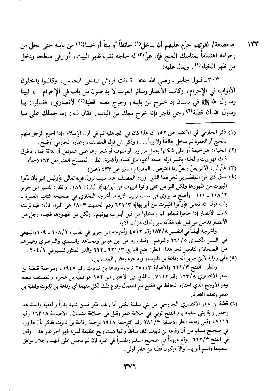 303 - قول جابر - رضي الله عنه - كانت قريش تدعى الحمس، وكانوا يدخلون الأبواب في الإِحرام، وكانت الأنصار وسائر العرب لا يدخلون من باب في الإِحرام، فبينا رسول الله - صلى الله عليه وسلم - في بستان إذ خرج من بابه، وخرج معه قطبة (¬5) الأنصاري، فقالوا: يا رسول الله إن قطبة (¬6) رجل فاجر فإنه خرج معك من الباب. فقال له: "ما حملك على ما