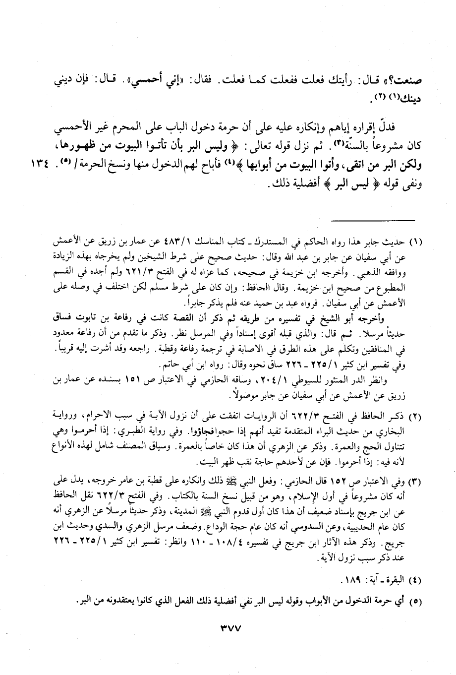 فدلّ إقراره إياهم وإنكاره عليه على أن حرمة دخول الباب على المحرم غير الأحمسي كان مشروعًا بالسنّة (¬3). ثم نزل قوله تعالى: {وَلَيْسَ الْبِرُّ بِأَنْ تَأْتُوا الْبُيُوتَ مِنْ ظُهُورِهَا وَلَكِنَّ الْبِرَّ مَنِ اتَّقَى وَأْتُوا الْبُيُوتَ مِنْ أَبْوَابِهَا} (¬4) فأباح لهم الدخول منها ونسخ الحرمة (¬5). ونفى قوله {لَيْسَ الْبِرُّ} أفضلية ذلك.