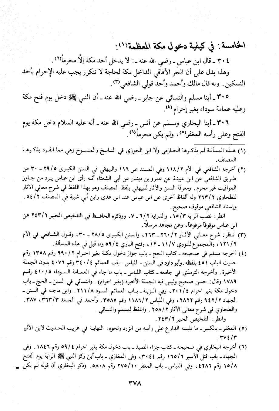 305 - أبنا مسلم والنسائي عن جابر - رضي الله عنه - أن النبي - صلى الله عليه وسلم - دخل يوم فتح مكة وعليه عمامة سوداء بغير إحرام (¬4).