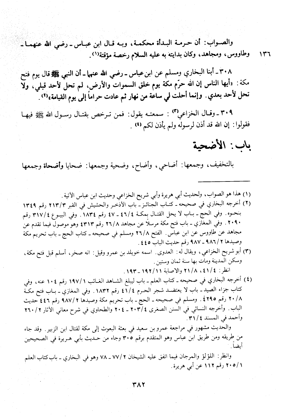308 - أبنا البخاري ومسلم عن ابن عباس - رضي الله عنهما - أن النبي - صلى الله عليه وسلم - قال يوم فتح مكة: "أيها الناس إن الله حرّم مكة يوم خلق السموات والأرض، لم تحل لأحد قبلي، ولا تحل لأحد بعدي. وإنما أحلت لي ساعة من نهار ثم عادت حرامًا إلى يوم القيامة" (¬2).
