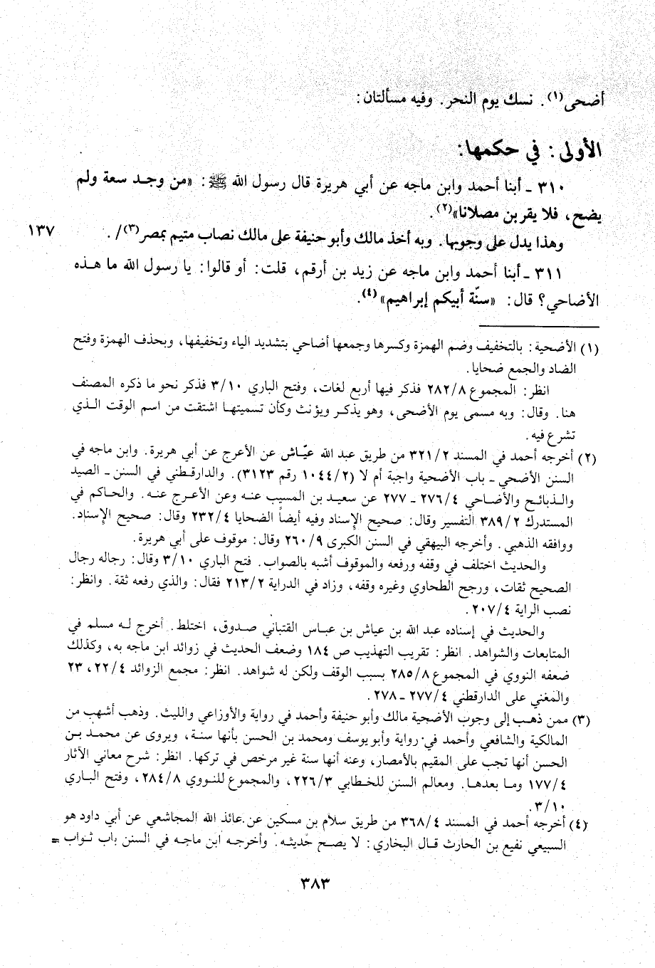 311 - أبنا أحمد وابن ماجه عن زيد بن أرقم، قلت: أو قالوا: يا رسول الله ما هذه الأضاحي؟ قال: "سنّة أبيكم إبراهيم" (¬4).