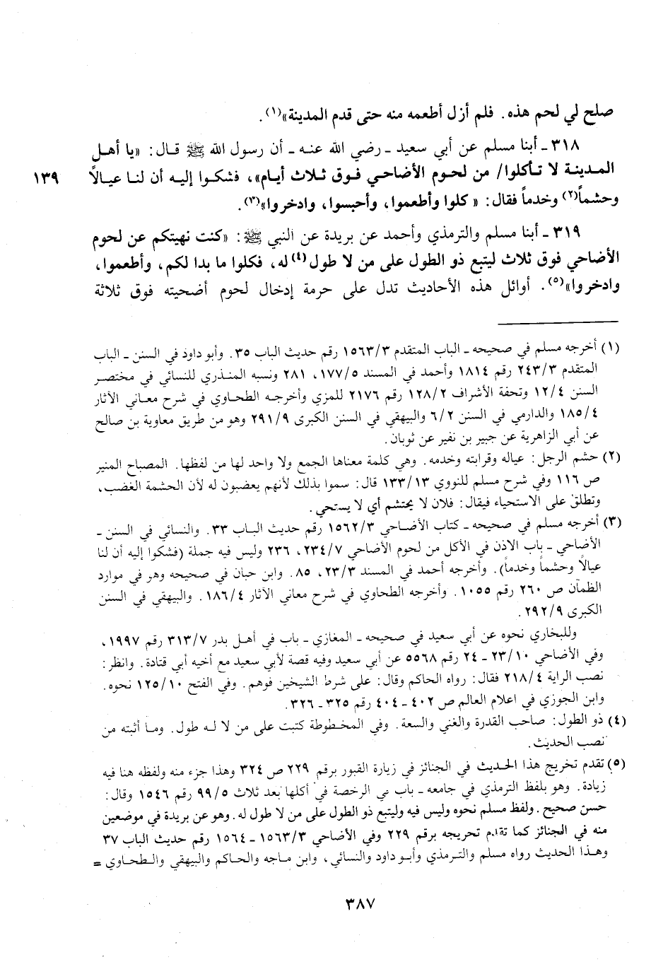 318 - أبنا مسلم عن أبي سعيد - رضي الله عنه - أن رسول الله - صلى الله عليه وسلم - قال: "يا أهل المدينة لا تأكلوا من لحوم الأضاحي فوق ثلاث أيام"، فشكوا إليه أن لنا عيالًا وحشمًا (¬2) وخدمًا فقال: "كلوا وأطعموا، وأحبسوا، وادخروا" (¬3).