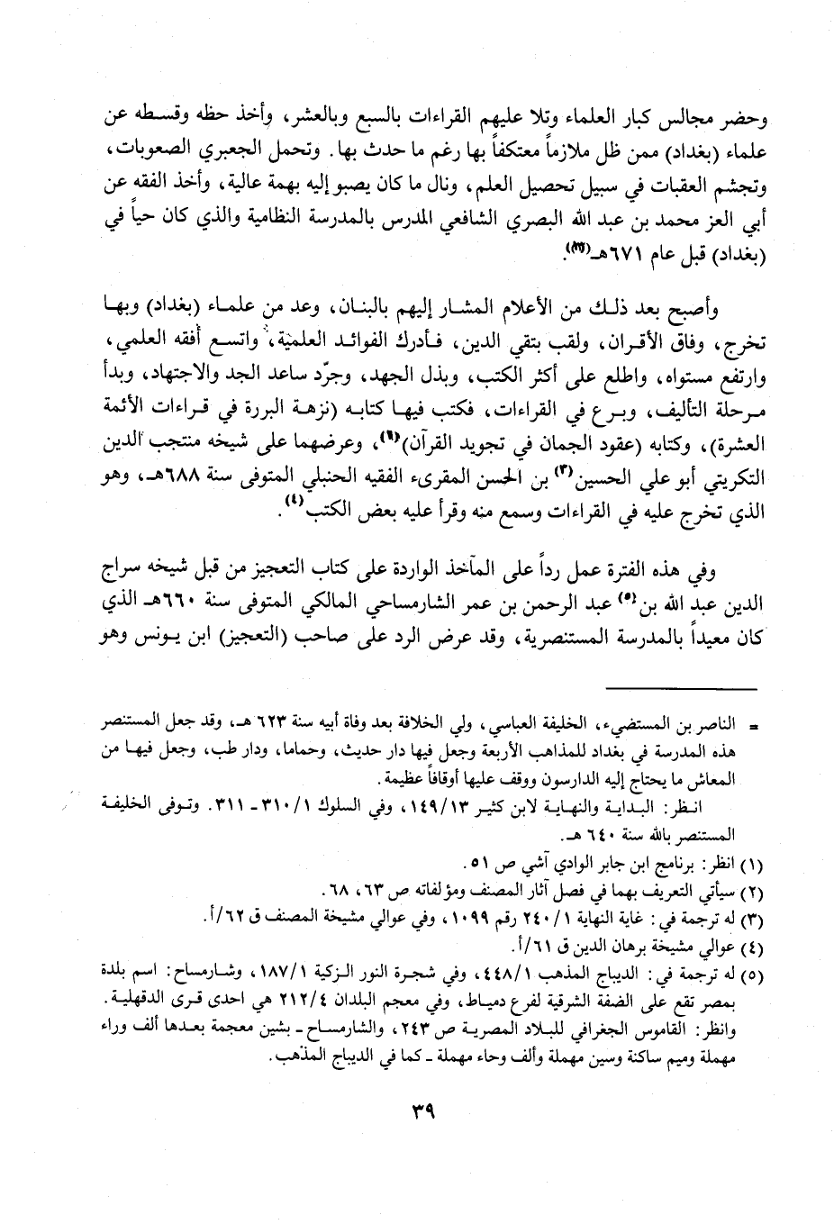 وفي هذه الفترة عمل ردًا على المآخذ الواردة على كتاب التعجيز من قبل شيخه سراج الدين عبد الله بن (¬5) عبد الرحمن بن عمر الشارمساحي المالكي المتوفى سنة 660 هـ الذي كان معيدًا بالمدرسة المستنصرية، وقد عرض الرد على صاحب (التعجيز) ابن يونس وهو