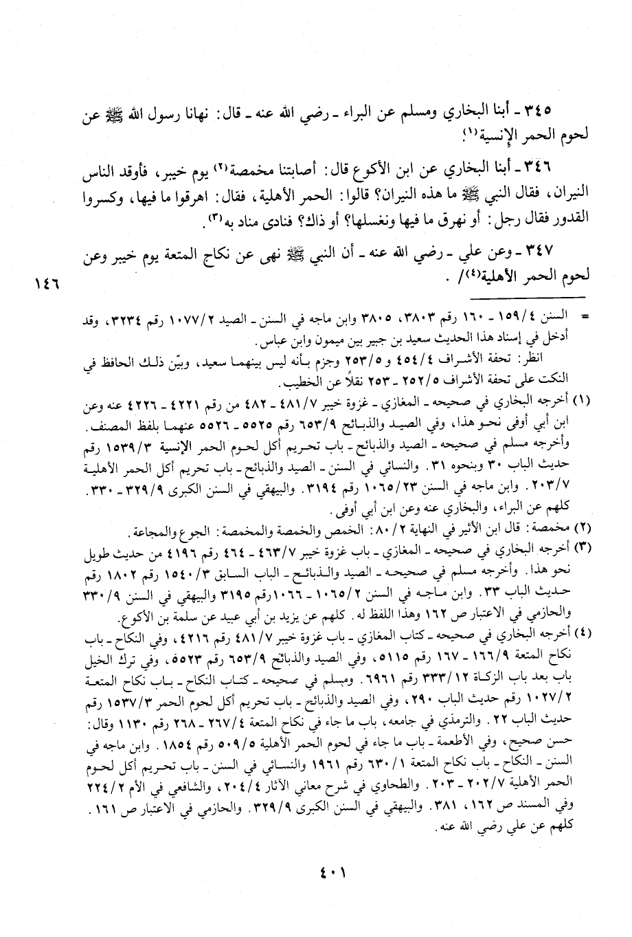 (¬4) أخرجه البخاري في صحيحه- كتاب المغازي- باب غزوة خيبر 7/ 481 رقم 4216، وفي النكاح- باب نكاح المتعة 9/ 166 - 167 رقم 5115، وفي الصيد والذبائح 9/ 653 رقم 5523، وفي ترك الخيل باب بعد باب الزكاة 12/ 333 رقم 6961. ومسلم في صحيحه- كتاب النكاح- باب نكاح المتعة 2/ 1027 رقم حديث الباب 290، وفي الصيد والذبائح - باب تحريم أكل لحوم الحمر 3/ 1537 رقم حديث الباب 22. والترمذي في جامعه، باب ما جاء في نكاح المتعة 4/ 267 - 268 رقم 1130 وقال: حسن صحيح، وفي الأطعمة - باب ما جاء في لحوم الحمر الأهلية 5/ 509 رقم 1854. وابن ماجه في السنن- النكاح- باب نكاح المتعة 1/ 630 رقم 1961 والنسائي في السنن- باب تحريم أكل لحوم الحمر الأهلية 7/ 202 - 203. والطحاوي في شرح معاني الآثار 4/ 204، والشافعي في الأم 2/ 224 وفي المسند ص 162، 381. والبيهقي في السنن الكبرى 9/ 329. والحازمي في الاعتبار ص 161. كلهم عن علي رضي الله عنه.