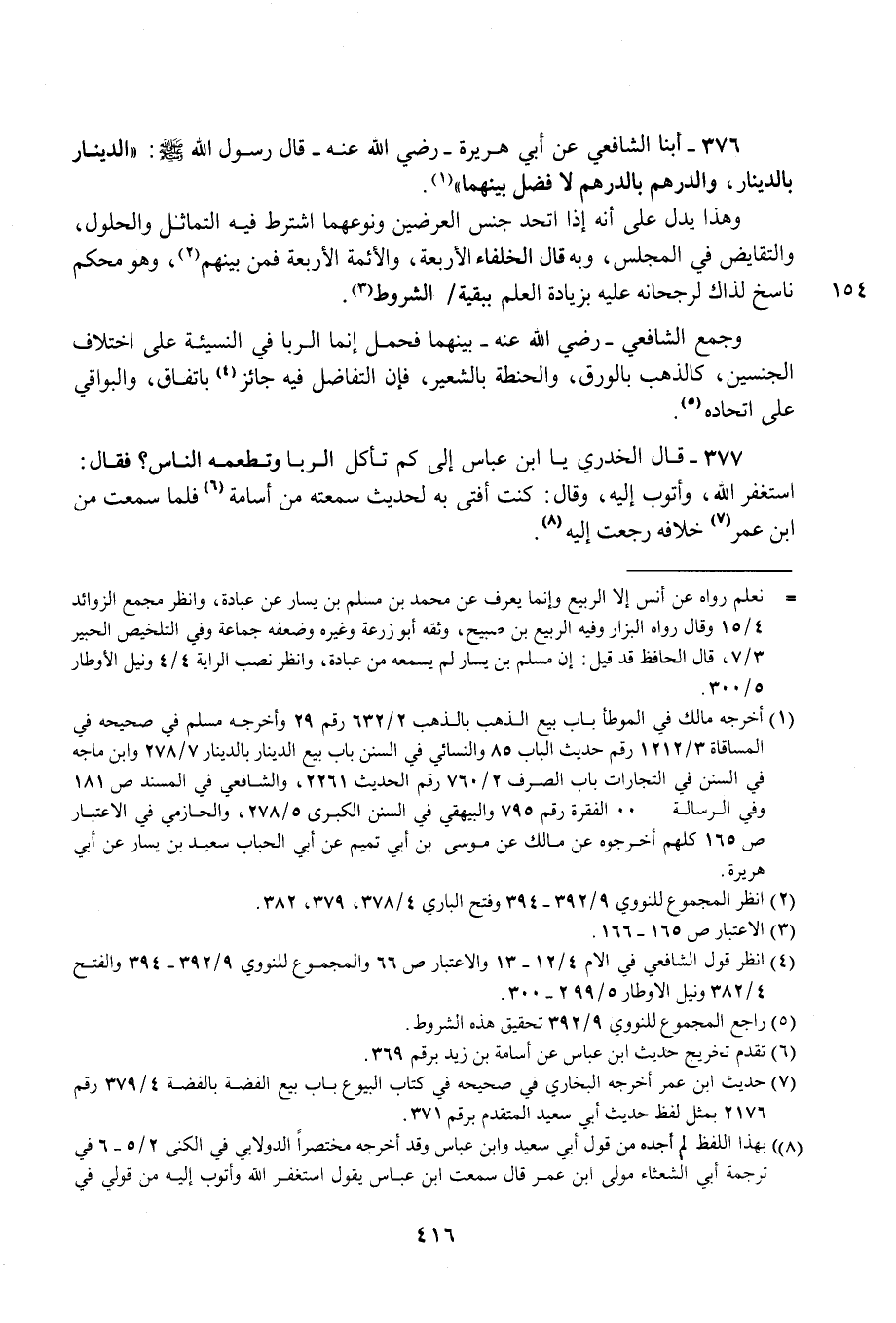 376 - أبنا الشافعي عن أبي هريرة- رضى الله عنه- قال رسول الله - صلى الله عليه وسلم -:"الدينار بالدينار، والدرهم بالدرهم لا فضل بينهما" (¬1).