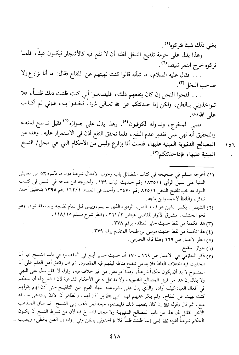 (¬7) ذكر الحازمي في الاعتبار ص 169 - 170 أن حديث جابر أبلغ في المقصود في باب النسخ غير أن الحديث فيه اختلاف ألفاظ فلا بد من تنقيح مناطه ليفهم فيه المقصود، ثم قال واتفق أهل العلم على أن المنسوخ لا بد أن يكون حكمًا شرعيًا، وهذا أمر مقرر من غير خلاف فيه، وقوله لا لقاح يدل على النهي ولا يقال إن هذا من قبيل المصالح الدنيوية، ولا مدخل له في الأحكام الشرعية لأن الشارع له أن يتحكم في أفعال العباد كيف أراد، والذي يدل على مشروعيته انتهاء القوم عن التلقيح حتى أذن لهم بقولهم كنت نهيت عن اللقاح، ولم ينكر عليهم فهم النبي - صلى الله عليه وسلم - بل أذن لهم، والظاهر أن الإذن يستدعي سابقة منع، ثم قال وقوله - صلى الله عليه وسلم - إن كان ينفعهم ذلك فليصنعوه حجة لمن ذهب إلى النسخ. ثم ساق المذهب الآخر القائل بأن هذا من باب المصالح الدنيوية ولا مجال للنسخ فيه لأن من شرط النسخ أن يكون الحكم شرعيًا لقوله - صلى الله عليه وسلم - إننى إنما ظننت ظنًا فلا تؤاخذوني بالظن وفي رواية إن الظن يخطئ ويصيب=
