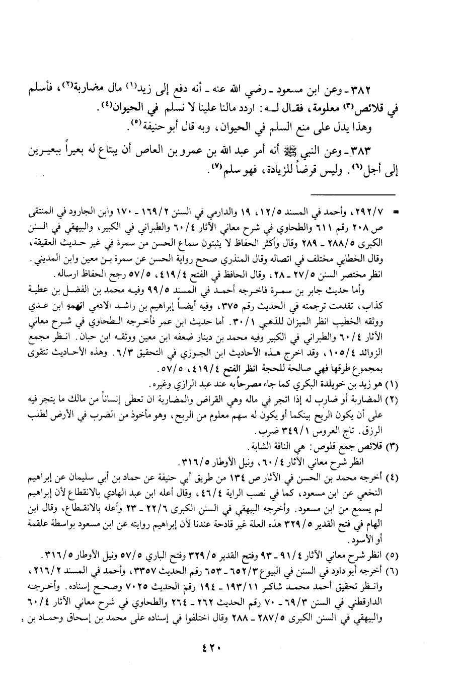 382 - وعن ابن مسعود- رضي الله عنه- أنه دفع إلى زيد (¬1) مال مضاربة (¬2)، فأسلم في قلائص (¬3) معلومة، فقال له: اردد مالنا علينا لا نسلم في الحيوان (¬4).