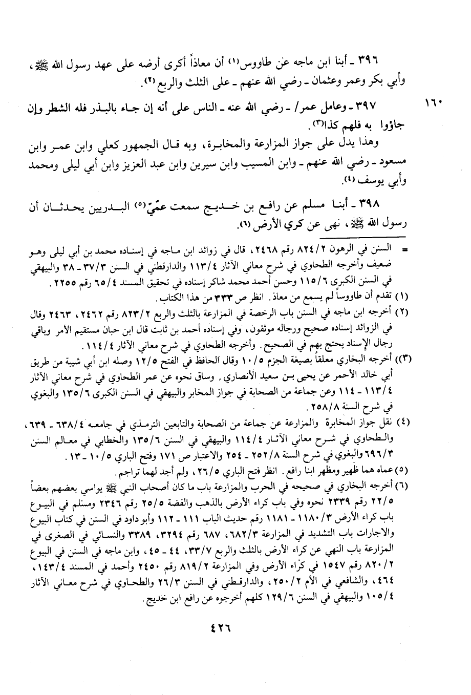 396 - أبنا ابن ماجه عن طاووس (¬1) أن معاذًا أكرى أرضه على عهد رسول الله - صلى الله عليه وسلم -، وأبي بكر وعمر وعثمان- رضي الله عنهم- على الثلث والربع (¬2).