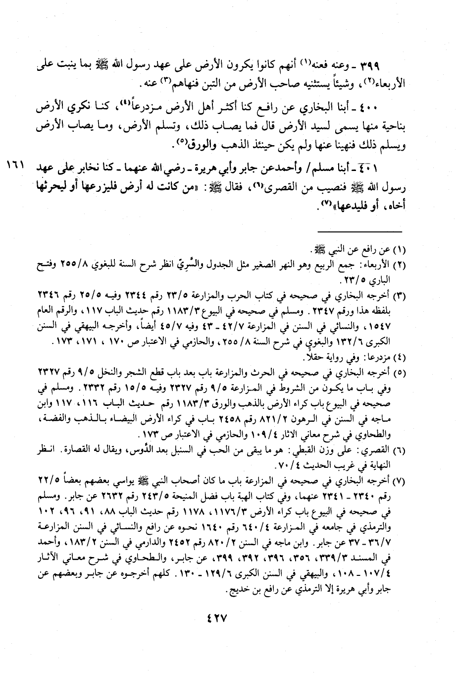 400 - أبنا البخاري عن رافع كنا أكثر أهل الأرض مزدرعًا (¬4)، كنا نكري الأرض بناحية منها يسمى لسيد الأرض قال فما يصاب ذلك، وتسلم الأرض، وما يصاب الأرض ويسلم ذلك فنهينا عنها ولم يكن حينئذ الذهب والورق (¬5).