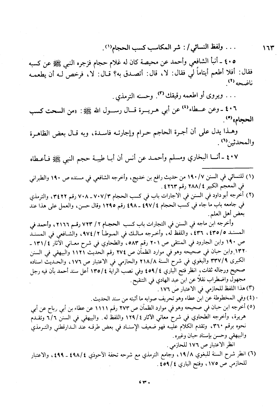 405 - أنبأ الشافعي وأحمد عن محيصة كان له غلام حجام فزجره النبي - صلى الله عليه وسلم - عن كسبه فقال: أفلا أطعم أيتامًا لي فقال: لا، قال: أتصدق به؟ قال: لا، فرخص له أن يطعمه ناضحه (¬2).
