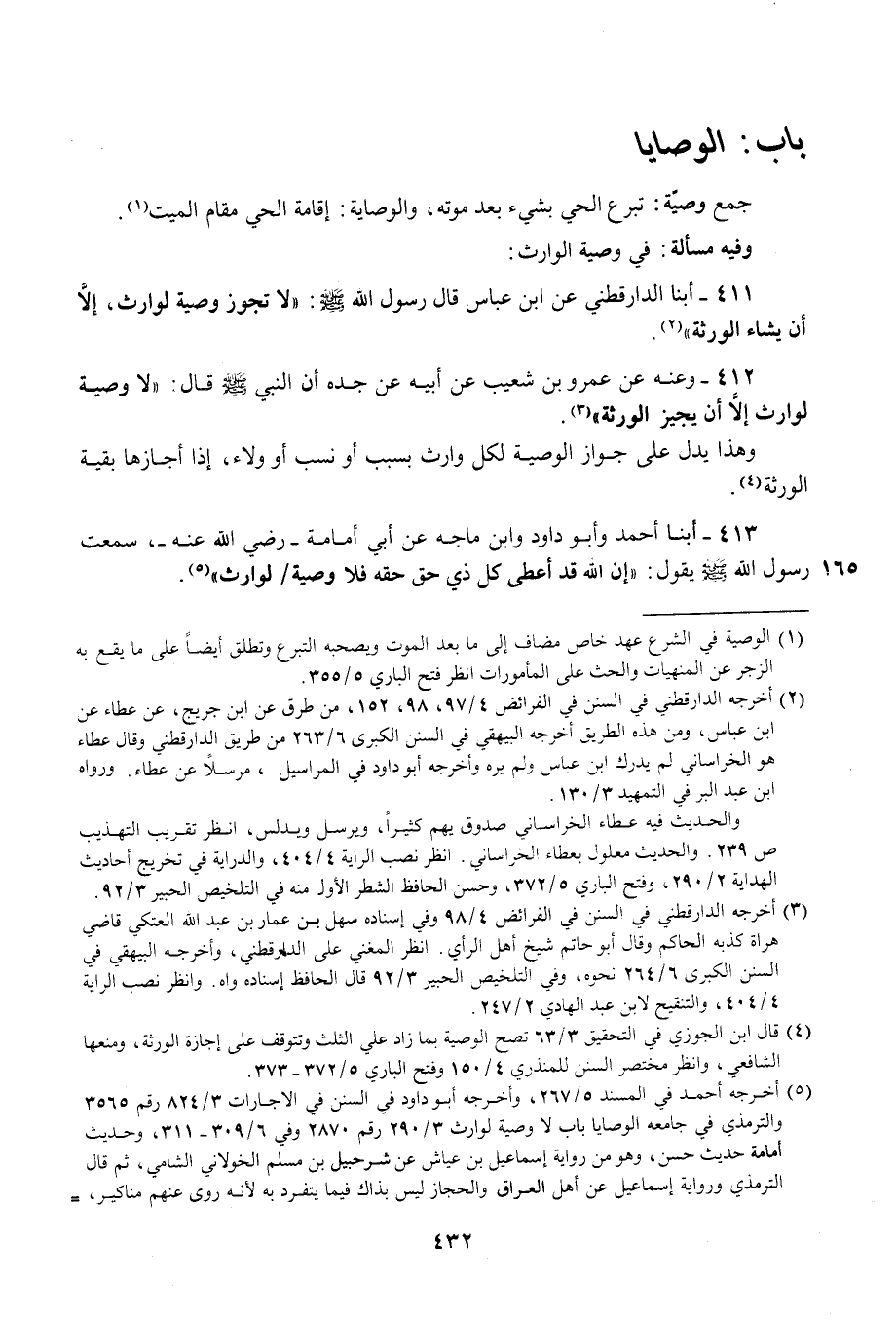413 - أبنا أحمد وأبو داود وابن ماجه عن أبي أمامة - رضي الله عنه-، سمعت رسول الله - صلى الله عليه وسلم - يقول: "إن الله قد أعطى كل ذي حق حقه فلا وصية لوارث" (¬5).