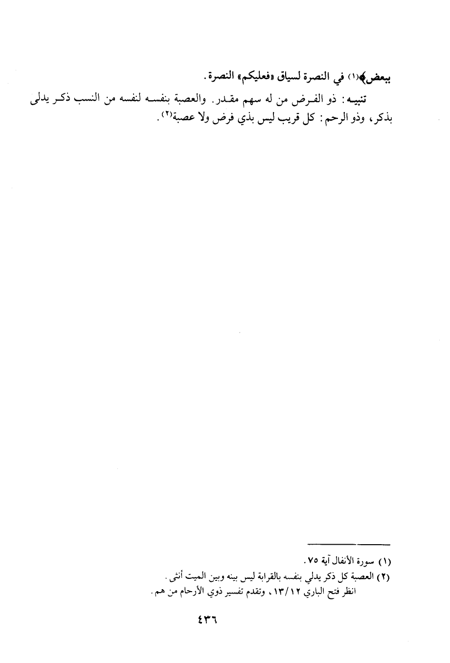 تنبيه: ذو الفرض من له سهم مقدر. والعصبة بنفسه لنفسه من النسب ذكر يدلى بذكر، وذو الرحم: كل قريب ليس بذي فرض ولا عصبة (¬2).