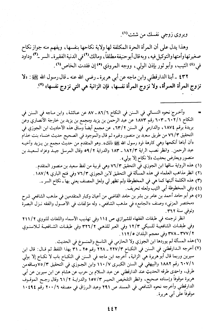 432 - أبنا الدارقطني وابن ماجه عن أبي هريرة- رضي الله عنه- قال رسول الله: - صلى الله عليه وسلم -: "لا تزوج المرأة المرأة، ولا تزوج المرأة نفسها، فإن الزانية هي التي تزوج نفسها" (¬7).