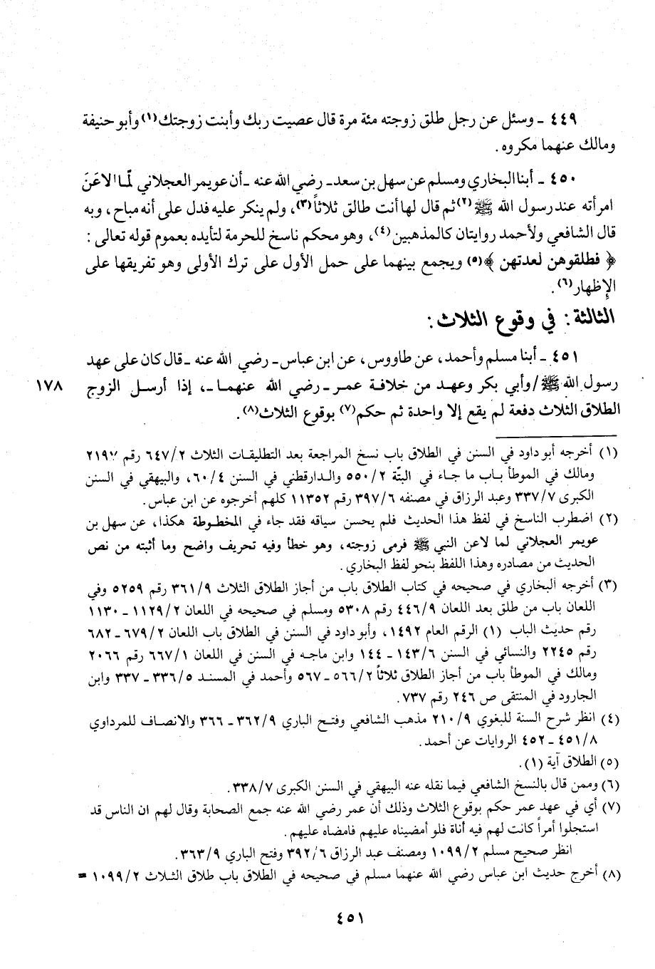 451 - أبنا مسلم وأحمد، عن طاووس، عن ابن عباس- رضي الله عنه- قال كان على عهد رسول الله - صلى الله عليه وسلم - وأبي بكر وعهد من خلافة عمر- رضي الله عنهما-، إذا أرسل الزوج الطلاق الثلاث دفعة لم يقع إلا واحدة ثم حكم (¬7) بوقوع الثلاث (¬8).