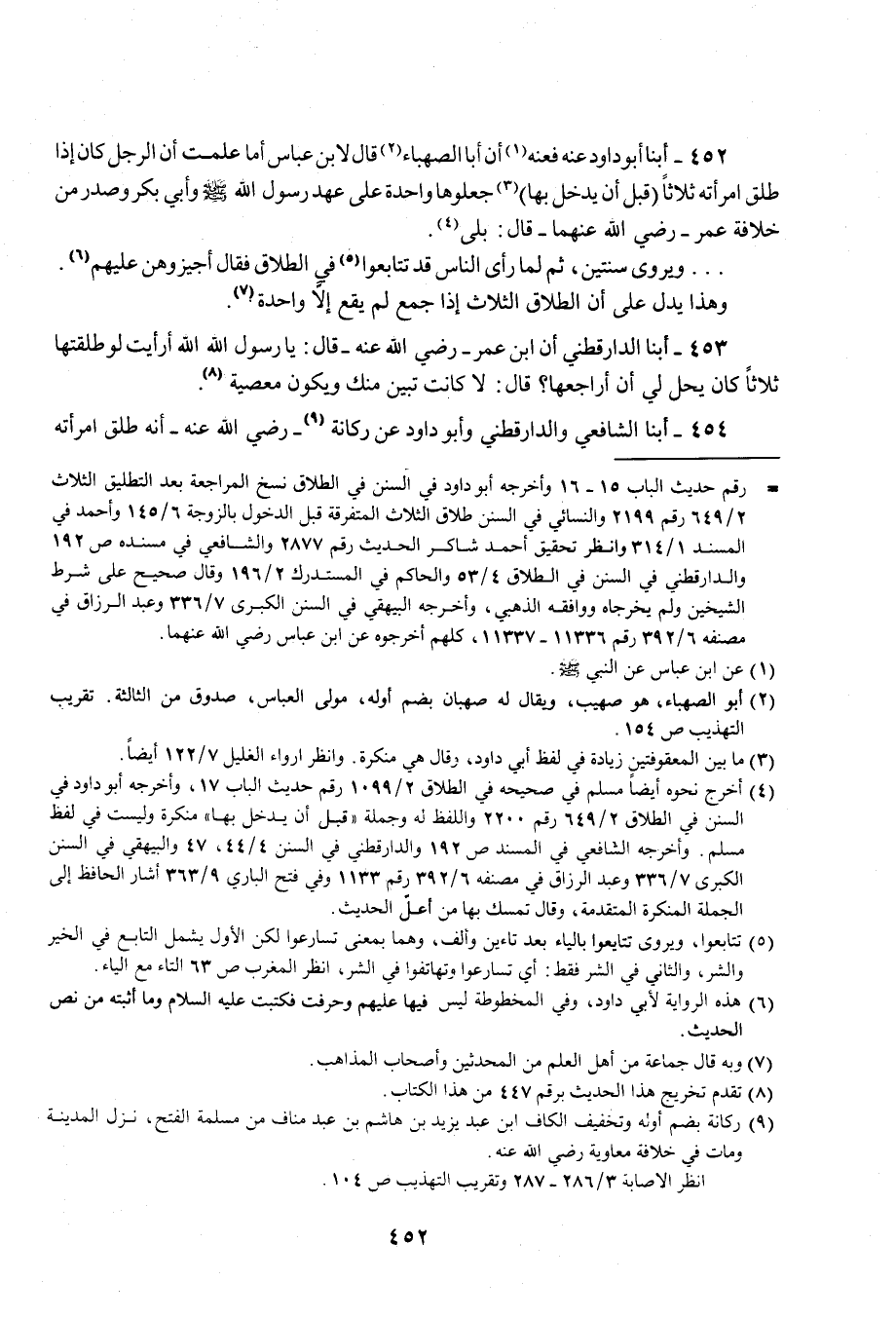 453 - أبنا الدارقطني أن ابن عمر- رضي الله عنه- قال: يا رسول الله الله أرأيت لو طلقتها ثلاثًا كان يحل لي أن أراجعها؟ قال: لا كانت تبين منك ويكون معصية (¬8).