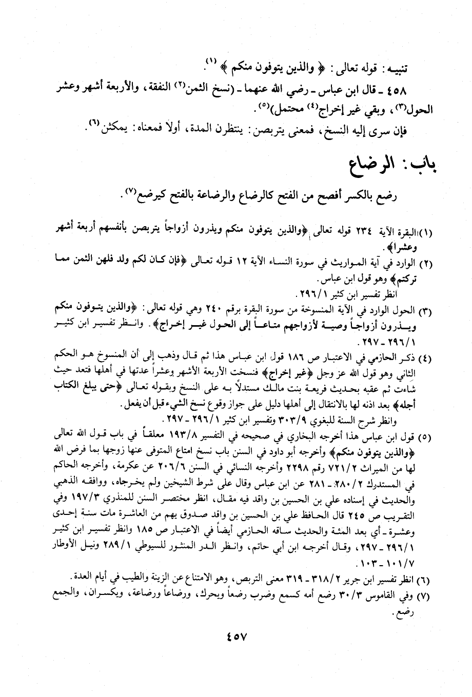 (5) قول ابن عباس هذا أخرجه البخاري في صحيحه في التفسير 8/ 193 معلقًا في باب قول الله تعالى {والذين يتوفون منكم} وأخرجه أبو داود في السنن باب نسخ امتاع المتوفى عنها زوجها بما فرض الله لها من الميراث 2/ 721 رقم 2298 وأخرجه النسائي في السنن 6/ 206 عن عكرمة، وأخرجه الحاكم في المستدرك 2/ 280 - 281 عن ابن عباس وقال على شرط الشيخين ولم يخرجاه، ووافقه الذهبي والحديث في إسناده علي بن الحسين بن واقد فيه مقال، انظر مختصر السنن للمنذري 3/ 197 وفي التقريب ص 245 قال الحافظ علي بن الحسين بن واقد صدوق يهم من العاشرة مات سنة إحدى وعشرة - أي بعد المئة والحديث ساقه الحازمي أيضًا في الاعتبار ص 185 وانظر تفسير ابن كثير 1/ 296 - 297، وقال أخرجه ابن أبي حاتم، وانظر الدر المنثور للسيوطي 1/ 289 ونيل الأوطار 7/ 101 - 103.