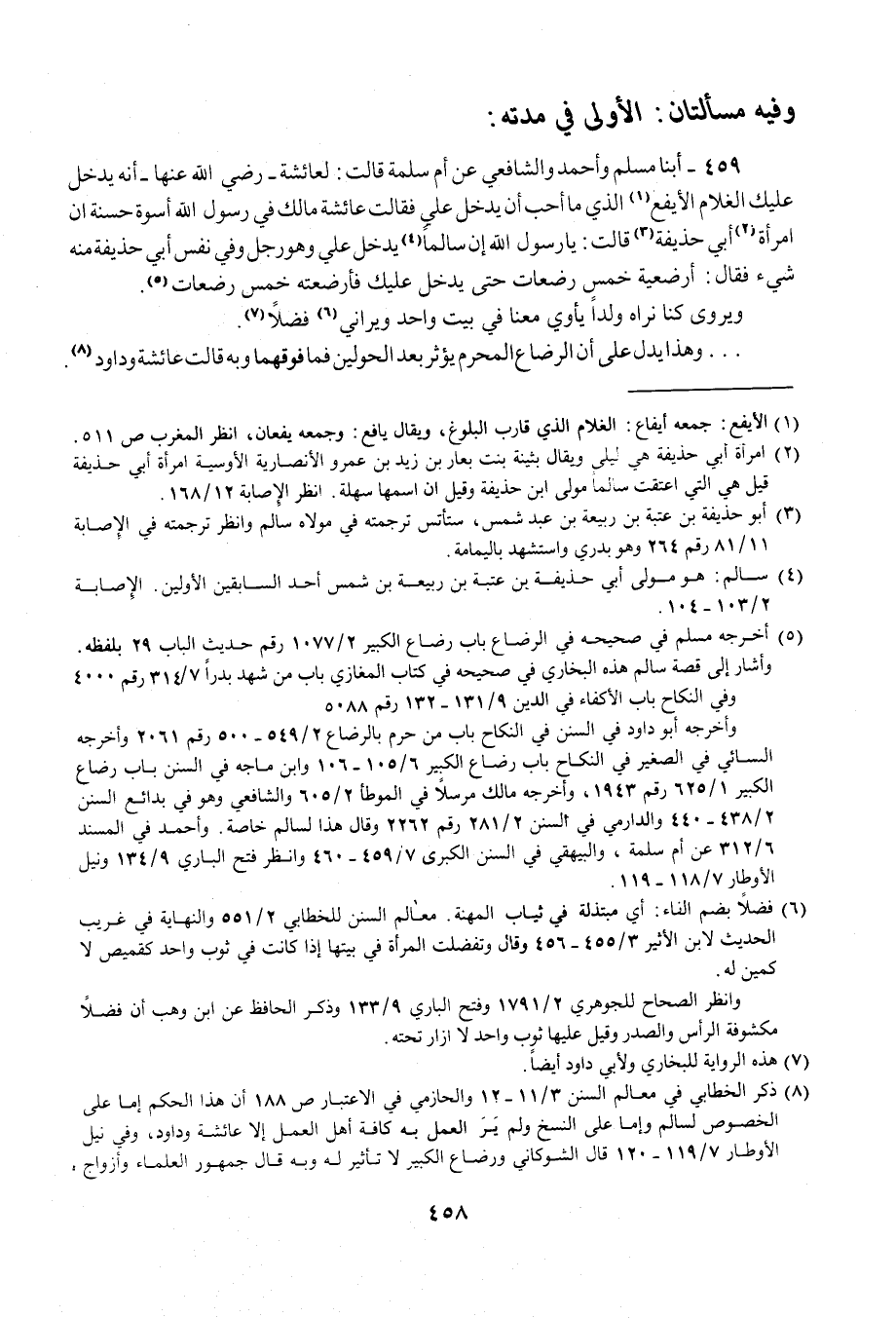 (¬8) ذكر الخطابي في معالم السنن 3/ 11 - 12 والحازمي في الاعتبار ص 188 أن هذا الحكم إما على الخصوص لسالم وإما على النسخ ولم يَرَ العمل به كافة أهل العمل إلا عائشة وداود، وفي نيل الأوطار 7/ 119 - 120 قال الشوكاني ورضاع الكبير لا تأثير له وبه قال جمهور العلماء وأزواج.
