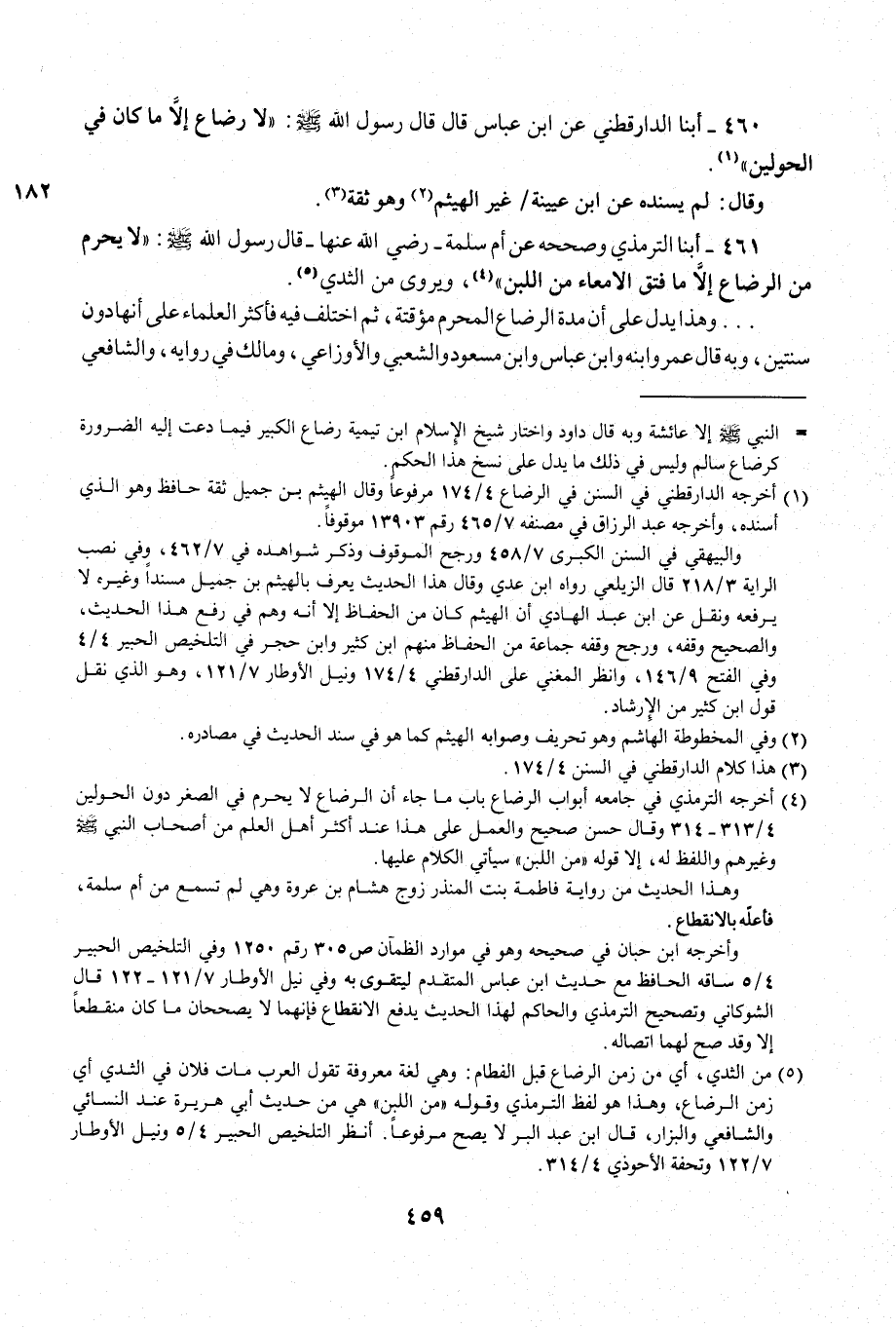 460 - أبنا الدارقطني عن ابن عباس قال قال رسول الله - صلى الله عليه وسلم -: "لا رضاع إلَّا ما كان في الحولين" (¬1).