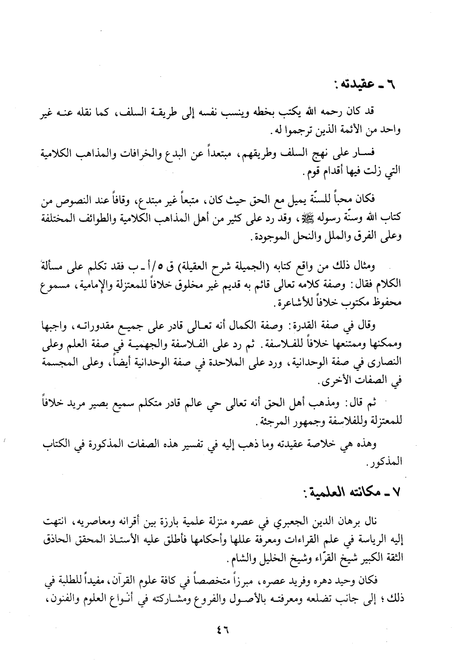 ومثال ذلك من واقع كتابه (الجميلة شرح العقيلة) ق 5/ أ - ب فقد تكلم على مسألة الكلام فقال: وصفة كلامه تعالى قائم به قديم غير مخلوق خلافًا للمعتزلة والإِمامية، مسموع محفوظ مكتوب خلافًا للأشاعرة.