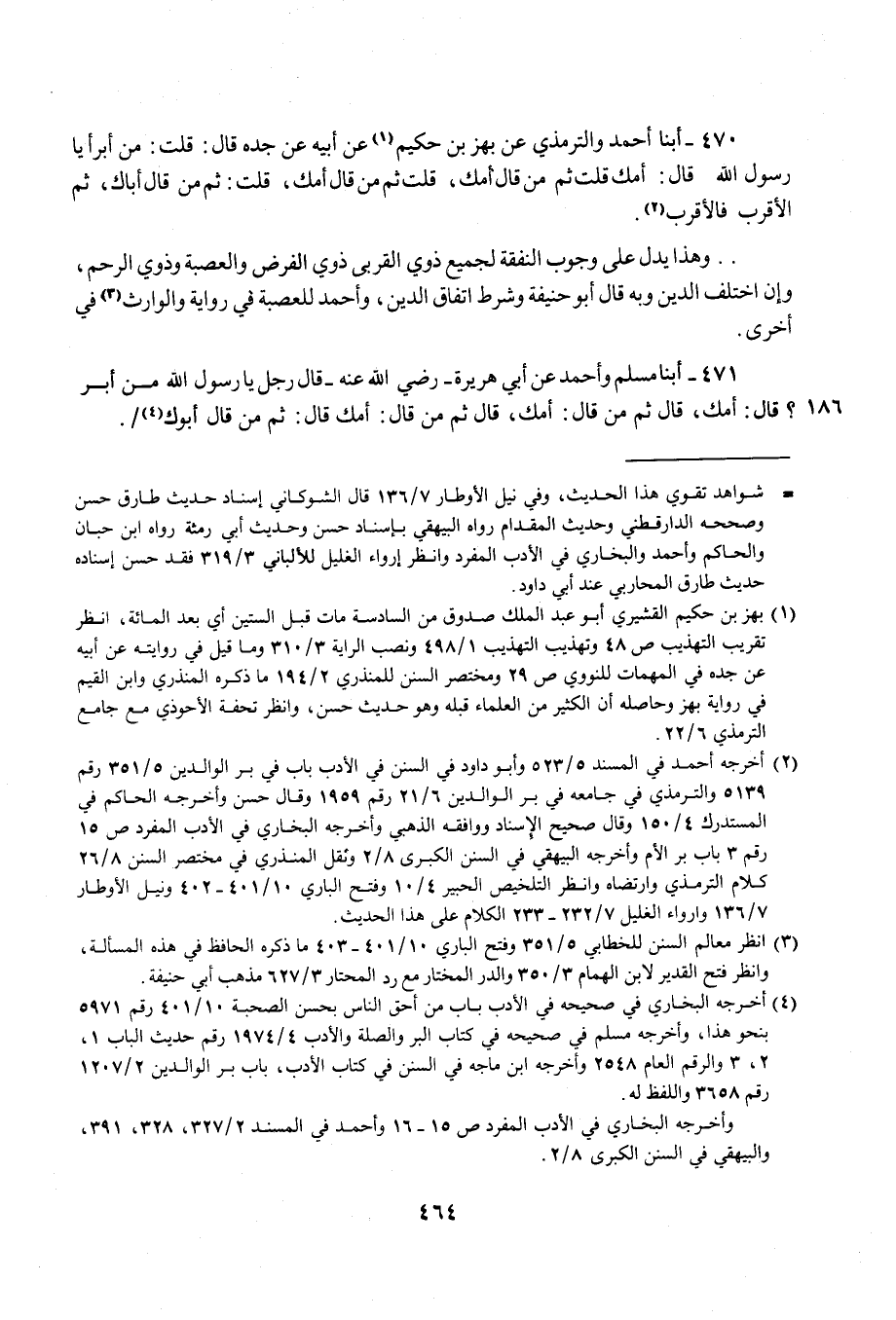 470 - أبنا أحمد والترمذي عن بهز بن حكيم (¬1) عن أبيه عن جده قال: قلت: من أبرأ يا رسول الله قال: أمك قلت ثم من قال أمك، قلت ثم من قال أمك، قلت: ثم من قال أباك، ثم الأقرب فالأقرب (¬2).