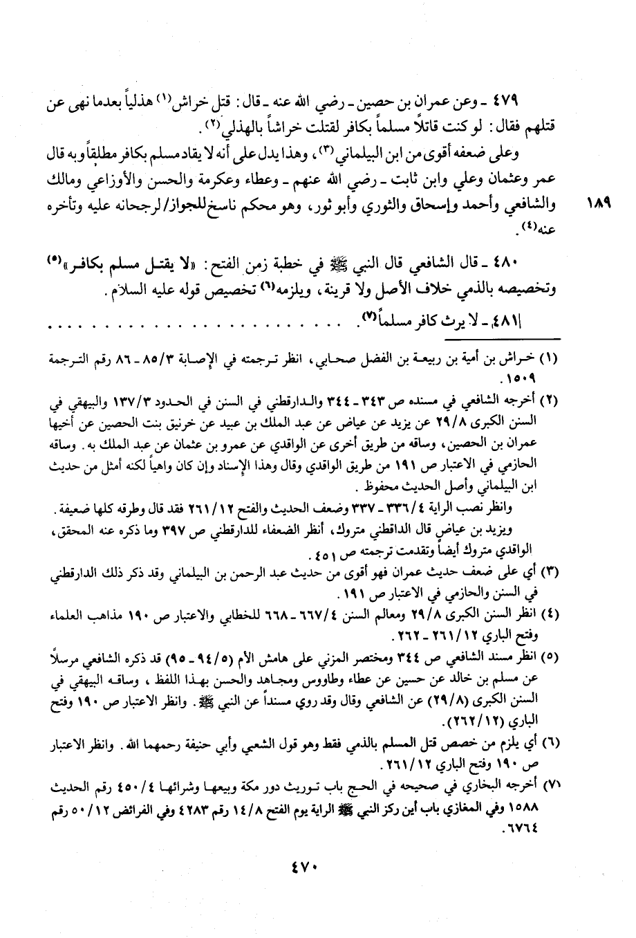 479 - وعن عمران بن حصين- رضي الله عنه- قال: قتل خراش (¬1) هذليًا بعدما نهى عن قتلهم فقال: لو كنت قاتلًا مسلمًا بكافر لقتلت خراشًا بالهذلي (¬2).