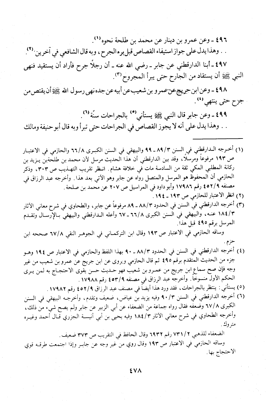 497 - أبنا الدارقطني عن جابر- رضي الله عنه- أن رجلًا جرح فأراد أن يستقيد فنهى النبي - صلى الله عليه وسلم - أن يستقاد من الجارح حتى يبرأ المجروح (¬3).