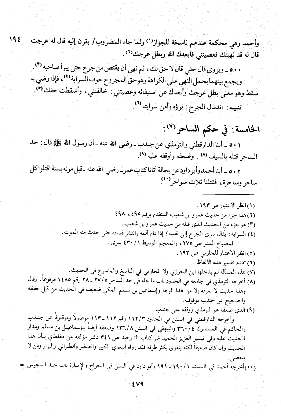 502 - أبنا أحمد وأبو داود عن بجالة أتانا كتاب عمر- رضي الله عنه- قبل موته بسنة اقتلوا كل ساحر وساحرة، فقتلنا ثلاث سواحر (¬10).