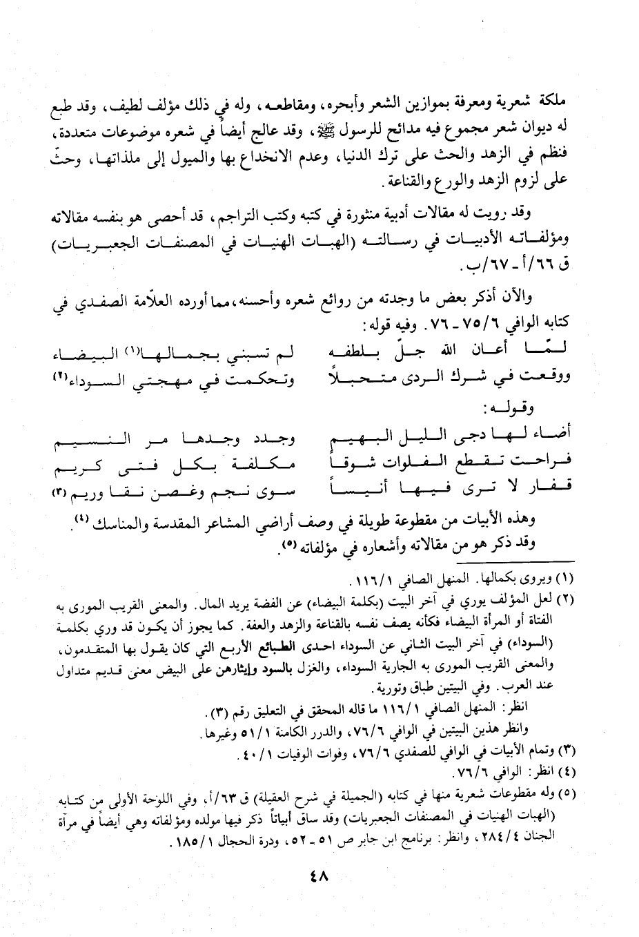 (¬5) وله مقطوعات شعرية منها في كتابه (الجميلة في شرح العقيلة) ق 63/ أ، وفي اللوحة الأولى من كتابه (الهبات الهنيات في المصنفات الجعبريات) وقد ساق أبياتًا ذكر فيها مولده ومؤلفاته وهي أيضًا في مرآة الجنان 4/ 284، وانظر: برنامج ابن جابر ص 51 - 52، ودرة الحجال 1/ 185.